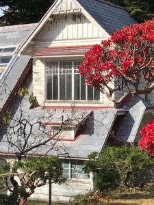 こちらは園内にある茶室です。中に入ると縁側に池が広がり別世界の感があります。園には様々な植物が植えられこれを維持するための道具を治める建物や盆栽などを育てるガラス張りの温室が完備されています。私はこの施設を見てトトロに登場する、さつきとめいの家を思い出します。残念ですが私にまっくろクロスケは見えませんでした。